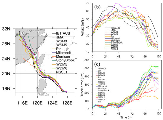 To further investigate the performances of MCPs in simulations, Figure 3a,b present the simulated tracks and intensities from the sensitivity experiments using the combination of the GF cumulus scheme and the other nine MPSs (including WSM3, WSM5, Eta, Milbrandt, Morrion, StonyBrook, WDM5, WDM6, and NSSL1, see Table 1). The simulated tracks of Doksuri for all the sensitivity experiments compare well with the best track from IBTrACS, except for the last day of the forecast (Figure 3a). Indeed, the model reasonably captures the translating directions of Typhoon Doksuri, but with a slightly northward deviation. For typhoon intensity, most of the sensitivity experiments showed significantly smaller magnitudes of Vmax than the best track data from IBTrACS during the RI period and also could not capture the re-intensification of typhoon over the SCS (Figure 3b).