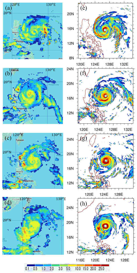 CTL well captured the translation direction of Doksuri in the first two days, as seen in Figure 2f. It is of great interest to show the simulated rainfall of the typhoon to reveal the activity of cloud convection. Figure 4 shows the simulated hourly accumulated rainfall of CTL from 12 to 48 h at intervals of 12 h. The rainfall observation available for verification is the hourly rainfall from the multi-satellite precipitation product from Jaxa (GSMaP) during the same simulation times. In general, the rainfall areas of GSMaP and CTL were similar and consistent with satellite images (figures not shown). However, the simulated precipitation from CTL was higher than that observed by GSMaP, particularly around the inner typhoon. The simulated heavy rainfall from CTL at 36 and 48 h over the northern Philippines was similar to GSMaP when the typhoon flow was impacted by the orographic lifting of the Philippines terrain, thus with increasing convection in this area (Figure 4c,d,g,h). The simulated accumulated rainfall also highlighted the primary region of latent heating associated with the typhoon across the Luzon Strait and through the SCS. Although the simulated convection associated with the intense typhoon was considerably stronger than the satellite observations (normally underestimated), their overall features (e.g., the eye, eyewall, and spiral clouds) were similar, except for some weakened convection over the north Philippines at 48 h.