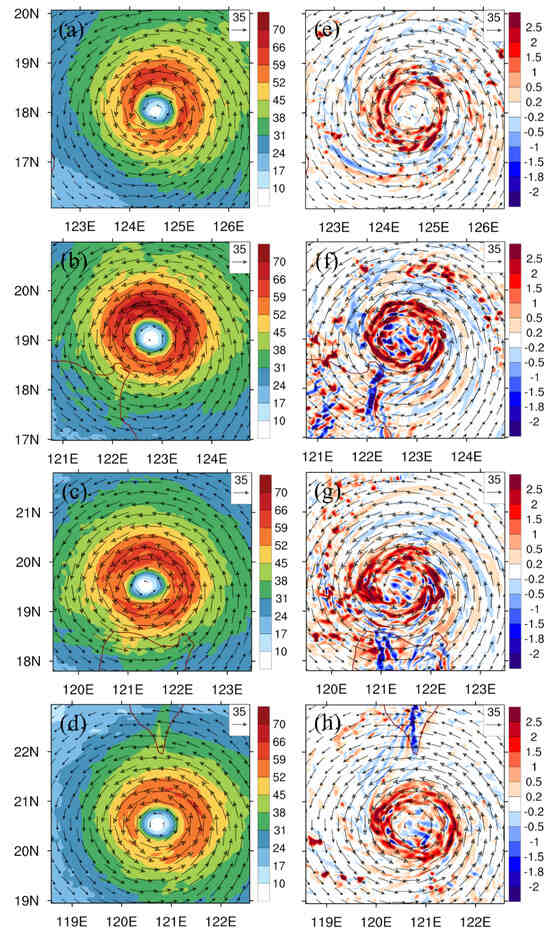 The evolution of the simulated horizontal wind and vertical velocity illustrates the typhoon’s translation and convection. Figure 5 shows that the simulated typhoon circulations averaged from 1 to 8 km at 36, 48, 60, and 72 h for CTL. As the simulated typhoon track shifts from west-northwestward to westward movement between 36 and 48 h, a stronger easterly wind develops north-northeast of the typhoon center (Figure 5a,b), accompanied by relatively more symmetrical vertical motions (Figure 5e,f). When Doksuri moves across the Luzon Strait, the vertical motions are influenced by the terrain. At 60 h, the east-southeasterly wind north-northeast of the typhoon center weakens compared to 48 h (Figure 5c). At this stage, while the horizontal wind is relatively more symmetric, the vertical motions exhibit a more asymmetric structure (Figure 5g), with stronger upward motions primarily in the west and east quadrants of the inner vortex. As the typhoon moves across the SCS, high-wind-speed zones again occur in the northeast of the inner vortex to induce a more northwestward component (Figure 5d). However, the upward motions now remain concentrated strongly in the west and east quadrants of the inner vortex (Figure 5h). The induced flow asymmetry, driven by the enhanced southeasterly wind, tends to steer the typhoon more northwestward.