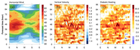 To illustrate the relation between the typhoon circulation and track evolution for Doksuri, Figure 6 shows the time evolutions of the simulated horizontal velocity, vertical velocity, and diabatic heating in the inner core concerning azimuthal variations from 0 to 96 h. Before 48 h, when the typhoon has a northwestward movement, stronger wind speeds are observed primarily northeast of the typhoon center (Figure 6a), accompanied by relatively symmetrical upward motions and diabatic heating (Figure 6b,c). When the typhoon moves across the Luzon Strait, the stronger horizontal wind speed rotates counterclockwise to the north of the typhoon center, and the wind speed weakens (Figure 6a), which tends to steer the typhoon more westward. During this period, the upward motions and diabatic heating remain a relatively more symmetric structure (Figure 6b,c). As the typhoon moves across the SCS (from 60 to 84 h), the horizontal velocity becomes stronger east of the typhoon center in response to its northwestward movement in concordance with Figure 5c,d. At this time, the stronger upward motions and diabatic heating are in phase and rotate counterclockwise from the northwest (at 60 h) to the south (at 84 h) of the typhoon center. Therefore, significant differences exist in the flow asymmetry and convection of Doksuri as it moves across the Philippine Sea, Luzon Strait, and the SCS.
