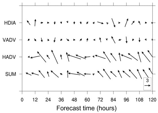 Time evolution of the translation velocity (vectors, m s−1) induced by different PV budget terms, including differential diabatic heating (HDIA), vertical PV advection (VADV), horizontal PV advection (HADV), and the sum of the former three terms (SUM), during the forecast time of 120 h for CTL.