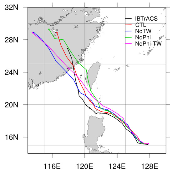 As Typhoon Doksuri approached the terrain of the Philippines and Taiwan, its track underwent significant changes. Initially, it moved northwestward across the Philippine Sea, then shifted westward through the Luzon Strait, and eventually took a northwestward to north-northwestward path across the SCS near Taiwan. Thus, it was of great interest for us to underline the relative impacts of both terrains on the track evolution of Doksuri at different stages in this study by conducting terrain sensitivity experiments. In the NoTW (without Taiwan terrain), NoPhi (without Philippines terrain), and NoPhi-TW (without Philippines and Taiwan terrain) experiments, the terrain of the entire Philippines or Taiwan, or both, was reset to a plain. Figure 8 shows the simulated tracks for CTL, NoPhi, NoTW, NoPhi-TW, and the best track data from IBTrACS. The track changes of all the sensitivity experiments after 48 h indicated that the track of Doksuri was somewhat sensitive to the Philippines and Taiwan terrains. Indeed, compared to CTL, NoTW slightly increased the northward deviation offshore of the northern Philippines before 72 h. In addition, NoPhi also resulted in a more northward deviation than CTL, leading Doksuri to make landfall in Taiwan before reaching South China. When both the Philippines and Taiwan were set to plain, the typhoon consistently maintained a northwestward translation most of the time. This suggests that the changes in Doksuri’s direction as it traversed the Luzon Strait and moved through the SCS near Taiwan were also influenced by the terrain at these oceanic regions.