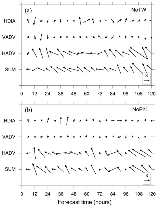 Similar to Figure 7, Figure 9 shows the contributions of different physical processes to the vortex translation of NoPhi and NoTW throughout the entire forecast times. Similar to CTL, the induced translations of NoTW and NoPhi agreed with their actual movements. For NoTW, the contribution of differential diabatic heating to the typhoon’s movement was more significant than in CTL (Figure 9a). NoTW failed to capture the westward translation during 48–60 h period (see Figure 7) that was mainly due to a northward to northeastward movement induced by the differential diabatic heating. Additionally, NoTW did not capture the north-northwestward movement on the last day, which was primarily due to northwestward movement contributed by horizontal PV advection. Resetting the Philippines terrain to a plain had only small impacts on vertical PV advection. For NoPhi, the contributions from vertical PV advection and differential diabatic heating were almost insignificant to the typhoon’s movement during most of the forecast times (Figure 9b). Therefore, the northward deflection of the typhoon after 48 h was mainly due to the contribution from horizontal PV advection. Notably, differential diabatic heating became more important for the northwestward movement of the typhoon during 24 to 48 h, contributing to a northward track. When the terrain of the entire Philippines or Taiwan was reset to a plain, it affected TC by altering their interactions with surrounding atmospheric conditions. Different terrains influence a TC circulation through various factors, including surface characteristics, moisture availability, wind patterns, and atmospheric dynamics. These factors modify the heating and cooling processes, which subsequently impact the structure, track, and intensity of the TC. As a result, diabatic heating, horizontal PV advection, and vertical PV advection are changed with different terrains. The terrain sensitivity experiments highlighted the typhoon track evolution in relation to PV dynamics that was not illustrated for similar typhoons by other published papers.