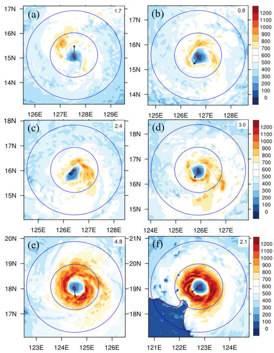 LHF (shaded colors, W m−2) for CTL at (a) 3 h, (b) 12 h, (c) 18 h, (d) 24 h, (e) 36 h, and (f) 48 h. Solid blue circles mark the 100 and 200 km radii from the typhoon center. The vector at the typhoon center denotes the VWS averaged within the radius of 0–800 km. The number in the top-right inset of each panel denotes the magnitude of VWS.