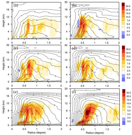 The transverse circulation can be largely driven by the effect of diabatic heating in the developing typhoon. Figure 11 shows the evolution of diabatic heating and tangential wind in the height-radius section for CTL. At 3 h, the diabatic heating is predominantly concentrated within a radius ranging from 0.4 to 2.0 degrees from the typhoon center (Figure 11a). The maximum diabatic heating peaks at approximately 22 K h−1 within a narrow radius of 0.6–0.65 degrees. Tangential wind velocities show two peaks around 40 m s−1, located at radii of about 0.6 and 0.9 degrees at this time. From 12 to 36 h, diabatic heating intensifies slightly, reaching a maximum magnitude of 30 K h−1, while tangential velocities increase significantly from 48 m s−1 at 12 h to 65 m s−1 at 36 h, with a single peak around a radius of 0.6 degrees from the typhoon center (Figure 11b–e). At 48 h, diabatic heating developed much stronger with a maximum magnitude above 30 K h−1 (Figure 11f). The great strengthening of diabatic heating leads to the fastest typhoon intensification by this time. Additionally, the tangential wind also steadily increases with an outward broadening during this period. From 12 h to 48 h, its strengthening has developed up to 12 km height, leading to an increase in the transverse circulation and resulting in stronger mean tangential wind velocity over 75 m s−1. This result is consistent with the findings of [59], who suggested that an enhancement of the primary circulation in the mid-to-upper troposphere is a critical factor for RI.