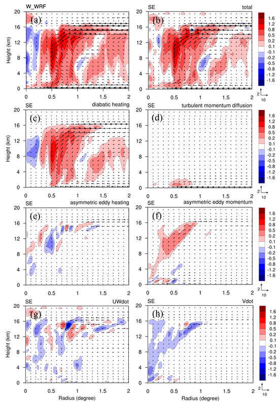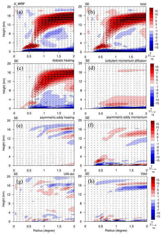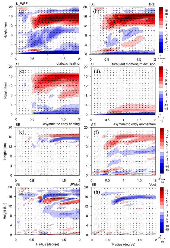 The effect of diabatic heating induces most of the transverse circulation below 17 km height. The symmetric diabatic heating notably induced considerable radial inflow in the boundary layer below 4 km and prominent mid-to-upper radial outflow between 8 and 17 km height (Figure 12c). Turbulent momentum diffusion induces intense radial inflow below 1 km and some weak radial outflow above and up to 4 km (Figure 12d). Asymmetric eddy heating primarily affects upper levels, specifically between 14 and 17 km height, with coupled radial inflow and outflow below and above 16 km, respectively (Figure 12e). Conversely, the impact of asymmetric eddy momentum is slightly smaller and spans from the boundary layer to the upper troposphere (Figure 12f). The contribution of and to the radial velocity are mainly concentrated in the upper level above 12 km height (Figure 11g). The has contributed to some radial outflow in the upper level at about 14 km height (Figure 12h), which may be offset by the radial inflow induced by the asymmetric eddy momentum (Figure 12f). In summary, the radial velocity at this time is mainly induced by the symmetric diabatic heating, consistent with previous studies [30,32].