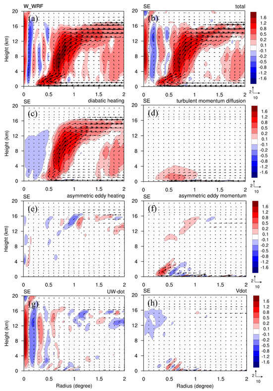 Figure 12 shows the radial velocity from the nonlinear simulation WRF for CTL and the radial velocity induced by the SE with total forcing sources and constituents (symmetric diabatic heating, turbulent momentum diffusion, asymmetric eddy momentum and heating, and the residual terms) at 24 h. The results show that the SE solution (Figure 12b) gives consistent radial velocity compared well with the nonlinear model results (Figure 12a), except for the underestimated upper-level outflow near 16 km height and the radial inflow in the mid-upper troposphere at 3–11 km height at a radius of 0.3–1.5 degrees. These comparisons indicate that the unbalanced SE solution may reasonably depict the developed transverse circulation of nonlinear simulation, even in the boundary layer.