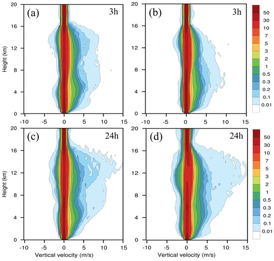 Contoured frequency by altitude diagrams (CFAD, %) of vertical velocity within a radius of 150 km from the typhoon center at 3 h for (a) WDM6 and (b) NSSL2. (c,d) as in (a,b), respectively, but at 24 h.