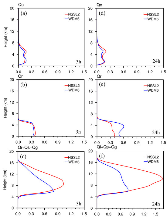 To gain a further understanding of the differences in the cloud microphysical processes, the distributions of cloud hydrometeors were considered. Figure 17 shows the vertical profiles of averaged mixing ratios within a radius of 200 km from the typhoon center for cloud water (Qc), rainwater (Qr), as well as the sum of ice (Qi), snow (Qs), and graupel (Qg) at 3 and 24 h for WDM6 and NSSL2. Qc is mainly concentrated at heights of 1–6 km for both experiments (Figure 17a,d). At 24 h, Qc for both NSSL2 and WDM6 develops at slightly higher levels but maintains the same magnitude compared to 3 h. In general, Qc above 3 km height is slightly stronger for NSSL2 at both 3 h and 24 h. Qr is primarily concentrated below 6 km height for both experiments, with the Qr values being almost similar at all levels at 3 h, while it is considerably larger for WDM6 at 24 h (Figure 17d,e). At 3 h, the total mixing ratios of ice-phase hydrometeors (Qi + Qs + Qg) for NSSL2 are considerably larger than those for WDM6 (Figure 17c). The peak value of the total mixing ratio (Qi + Qs + Qg) is about 0.7 kg kg−1 and occurs at 5 km height for WDM6, while for NSSL2, it is about 1.0 kg kg−1 and occurs at a higher level of around 8 km. At 24 h, the mixing ratios for both experiments increase and develop to higher levels compared to 3 h (Figure 17f). We note that both Qi and Qs for NSSL2 are much larger than WDM6, while the associated Qg is considerably smaller (figures not shown). The larger ice-phase hydrometeors for NSSL2 can be attributed to the developed higher and stronger vertical updrafts in Figure 16. The findings indicate that the mixing ratios produced by the stronger experiment (NSSL2) are larger than those of the weaker experiment (WDM6). Additionally, the convective activity in NSSL2 is greater than in WDM6, resulting in a more vigorous intensification of the typhoon. Thus, more accurately simulating the ice-phase hydrometeors is vital to the upper vortex development at the RI stage as shown for NSSL2 in Figure 16.