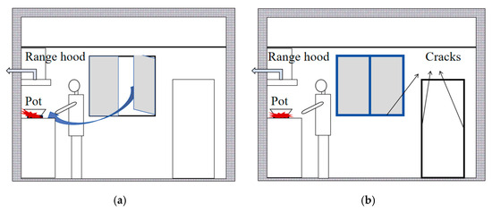 Owing to severely cold weather, opening the kitchen windows during cooking can result in an abrupt reduction in indoor temperature and cause the stove flame to shift, as shown in Figure 1a. This severely affects thermal comfort and the cooking process. People tend to close doors and windows during cooking, as shown in Figure 1b. This is likely to cause an evident decrease in the exhaust capacity of the range hood and severe indoor air pollution. The proposed CMA can achieve smoke exhaust effects similar to those of fresh air supply below the stove (shown in Figure 1c) [26]. However, it does not occupy the storage space and incurs lower construction and maintenance costs. Furthermore, fresh air can be heated marginally by the ceiling. This can potentially increase the indoor air temperature.