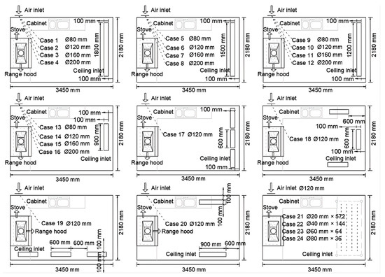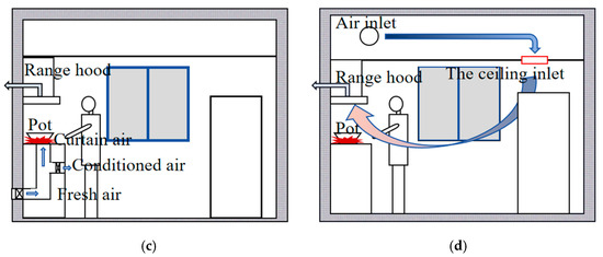 The cracks on the door and window, air inlet, and ceiling inlet were set as pressure inlets. The range hood was set as a velocity outlet, and a specific value was set according to the results of the air volume test. The assumed human surface temperature was 30 °C [43], and the distance from the human surface to the stove was 0.15 m. Based on the experimental results for the temperature variation in the pot body during the heating process [44], the temperature of the pot surface was 246 °C, and that of the outer wall was set at 65 °C. According to experimental data and standards, the ground temperature was assumed to be 25 °C [45], and the initial indoor temperature was assumed to be 20 °C. The pot surface was assumed to be a PM2.5 emission surface. Zhao et al. found that the PM2.5 mass velocity range of Chinese cooking is 5.3 × 10−8 kg/s–1.34 × 10−7 kg/s [10]. After the experimental analysis, this study set the mass flow rate of PM2.5 to 9 × 10−8 kg/s and the flow velocity to 0.1 m/s. For the performance evaluation and scheme optimization of the ventilation system with CMA, various structural model schemes were designed (Figure 4).