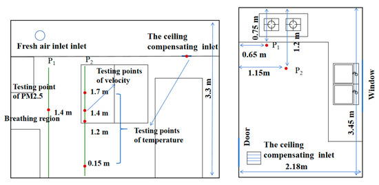 The sampling points for each parameter in this test were established according to the Chinese testing standard “Public Health Testing Methods—Part 1: Physical Factors” [31]. The parameters of the experimental equipment are shown in Table 2. The air temperature at heights of 0.15 m, 1.2 m, 1.4 m, and 1.7 m on the line P2 in the kitchen plan was measured by four RS485 recorders. In addition, the temperature of the outdoor air and ceiling inlets was recorded by temperature recorder. The measurement accuracy of the temperature recorder is ±0.5 °C. The test frequency was set to 0.1 Hz. The air velocity was recorded by Testo (405 i). It has a measuring accuracy of ±0.1 m/s. It was placed 1.4 m above the ground on the line P2. The test frequency was 10 s. The temperature and air velocity were recorded before the experiment, and the data were collected after the experiment. The computer initiated all the instruments. This ensured synchronized recording. This study also assessed the kitchen concentration of PM2.5 during cooking. A DUST-TRAK-II aerosol monitor (model 8534) with an accuracy of 0.001 mg/m3 and a measurement frequency of 10 s was employed. It was located in the breathing area of the subjects, i.e., line P1 at 1.4 m from the ground.