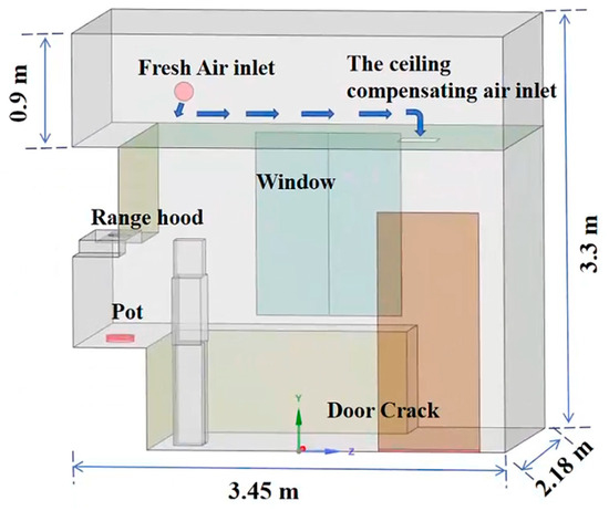 The performances of CMA, WMA, and GMA were studied, and the ventilation system with CMA was optimized. This study used the method of computational fluid dynamics (CFD) to simulate the changes in multiple parameters in the kitchen during cooking for 300 s. The step size of 0.1 s was used for simulation calculations by comparing and analyzing the effects of cooking on kitchen temperature, velocity, and PM2.5 concentration at different times. In terms of modeling, the turbulence numerical simulation method adopts the transient Reynolds-averaged Navier–Stokes (RANS) equations [41], and the achievable k-ԑ turbulence model combined with the Discrete Phase Model (DPM) discrete phase model is used to capture PM2.5 particles. The SIMPLE (Semi-Implicit Method for Pressure Linked Equations) algorithm was employed in the numerical method to couple the pressure and velocity equations [26]. The model was simplified to achieve computational fluency, as shown in Figure 3. The room size was 3.45 × 2.18 × 3.3 m (including the ceiling space height of 0.9 m). Using the floor radiation heating form, the kitchen cabinet and hood structure were considered as walls, the exhaust outlet size of the range hood was φ 180 mm, the door seam size was simplified to 0.81 × 0.02 m, the size of the ceiling air inlet hole was φ 160 mm, and the human body was simplified to 0.25 × 0.35 × 1.6 m. The simplification of an overall model can improve the grid quality, reduce the calculation cycle, and satisfy the simulation requirements [42].