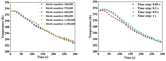 To verify the independence of the grid, the number of divided grids was increased from 440,000 to 1,190,000, and steps were set at 0.05 s, 0.1 s, 0.5 s, and 1 s. No significant differences were observed in the simulation results of the average indoor temperature shown in Figure 5. This indicates that the grid independence verification validated the number of grids and time steps. The final number of selected grids was 890,000, and the step size of 0.1 s was used for simulation calculations. The maximum dimension was 35 mm in the X, Y, and Z directions, and the minimum dimension was 2 mm.