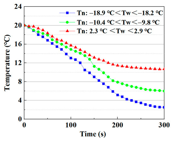 To understand the impact of different outdoor climates on the CMA scheme, this study tested the indoor temperature (Tn) variations at the ceiling air inlet at average outdoor temperatures (Tw) of 2.5 °C, −10.2 °C, and −18.5 °C, as shown in Figure 7. Introducing fresh air into the suspended ceiling space and extending the route of the fresh air flow can increase the temperature at which fresh air enters the room. Under three outdoor temperature conditions, the temperature at the ceiling air inlet after 10 min of cooking was 14.2 °C, 6.1 °C, and 2.2 °C, respectively. That is, the temperature of outdoor fresh air entering the kitchen increased effectively. The ventilation system with CMA scheme can alleviate the discomfort caused by the rapid temperature reduction when fresh air enters the room directly.