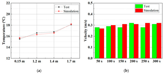 Comparison of the experimental data with the simulation data. (a) Temperature; (b) Velocity.