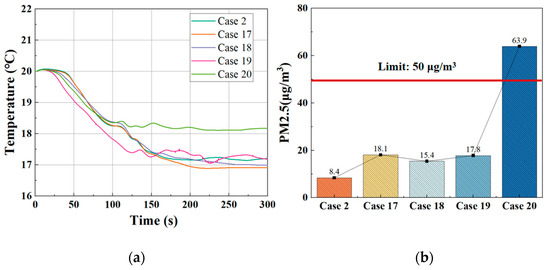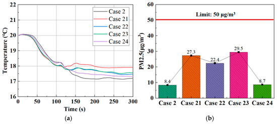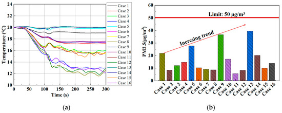 The indoor temperature and average PM2.5 concentration in the respiratory zone in Cases 1–16. (a) Temperature; (b) PM2.5 concentration.