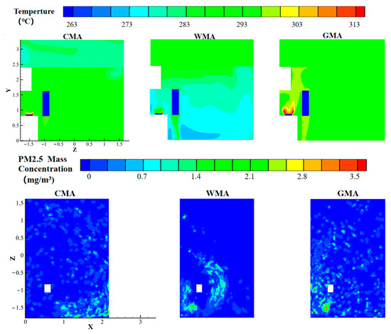 The limitation of this experiment is its capability to test only a few selected points. To comprehensively understand the distribution of monitoring parameters in the kitchen area, simulation methods were used to calculate the distribution of the indoor temperature and PM2.5 concentration in the respiratory zone under the ventilation system with the CMA scheme (Case 2), WMA scheme, and GMA scheme. The distributions of the indoor temperature at X = 0.56 m and PM2.5 concentration at Y = 1.4 m under three ventilation schemes are presented in Figure 12. Under the ventilation system with the WMA scheme, the indoor temperature distribution underwent significant variations. Additionally, the PM2.5 concentration in the breathing area of the human body was maintained at a low level, owing to the adequate ventilation volume. Although the overall concentration of indoor PM2.5 was low, due to the unreasonable airflow organization, the concentration of PM2.5 on the left side of the body was relatively high. Under the ventilation system with the CMA scheme, the indoor temperature distribution demonstrated less variation and a lower PM2.5 concentration in the human respiratory zone. Under the ventilation system with the GMA scheme, the indoor temperature distribution varied less. However, the PM2.5 concentration in the human respiratory zone was also higher owing to the small ventilation volume.
