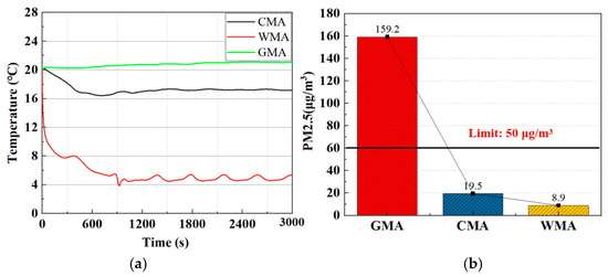 Variation in indoor temperature and PM2.5 concentration in the respiratory zone under ventilation systems with CMA scheme, WMA scheme, and GMA scheme. (a) Temperature; (b) PM2.5 concentration.