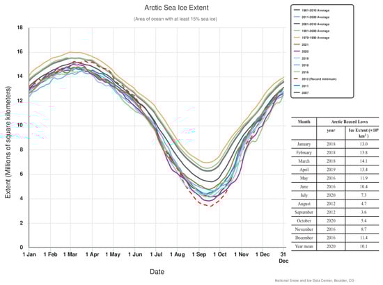 Per ten-year variation in the annual cycle of Arctic Sea ice extent with eight lowest sea ice years (e.g., 2007, 2011, 2012, 2016, 2018, 2019, 2020, 2021). Figure and Table is from the National Snow and Ice Data Center (NSIDC; https://nsidc.org/arcticseaicenews/charctic-interactive-sea-ice-graph/, accessed on 1 June 2024) and ref. [].