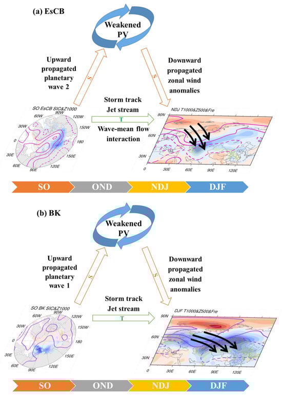 The complex physical mechanisms involving various interactions and feedback processes that seek to elucidate the causality of the Arctic–midlatitude connection have received wide attention and deep discussion [,]. Cohen et al. [] provided a comprehensive overview of three potential dynamic pathways through which the Arctic influences midlatitude climate variability, including storm tracks [,], jet streams [], and large-scale planetary waves []. Recent studies have further categorized the physical processes into stratospheric and tropospheric pathways. The stratospheric pathway generally involves the vertical propagation of quasi-stationary planetary waves [,]. By conducting several stratospheric nudging experiments, Zhang et al. [] underscored the crucial role of stratospheric processes in inducing robust cold Siberia in winter due to BK sea ice loss, while tropospheric processes merely contribute to Arctic warm anomalies. The enhancement of upward propagated quasi-stationary planetary waves, resulting from the resonance of planetary wave 1 with increased amplitude, leads to a deceleration of the zonal westerly winds through wave-mean flow interaction and a weakening of the stratospheric polar vortex. Subsequently, the downward propagation of self-persistent stratospheric signals enhances tropospheric anticyclonic anomalies in the following 1–2 months, facilitating Eurasian cooling and cold surge events. Similar stratospheric processes can be observed in the impact of EsCB sea ice loss, with a predominant contribution from the resonance of planetary wave 2 [,,] (Figure 2).