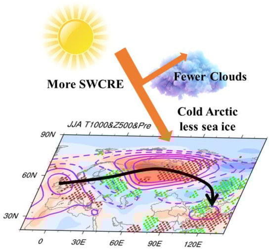 In addition to the influence of underlying surface external forcing, some scholars have examined the potential simultaneous relationship between Arctic atmospheric anomalies and weather and climate change in mid-low latitudes (Figure 3). Rinke et al. [] highlighted that the evolution of summer cloud radiation feedback associated with sea ice melt exerts the opposite role of low-level clouds in the reanalysis [] and simulation results. Liu et al. [] proposed that positive shortwave cloud radiative effect (SWCRE) anomalies over northern Russia promote the intensification of Ural anticyclonic anomalies, dynamically triggering downstream development of a positive Eurasian pattern, leading to positive (negative) precipitation anomalies in northern (southeastern) China and persistent East Asian heatwaves between 20° N and 40° N. Particularly during the North Atlantic Oscillation (SNAO) positive phase, positive northern Russian SWCRE events are more conducive to strengthening the upstream wave train, as the southward extended Ural anticyclone anomaly is easily trapped by the northward shifted South Asian jets, subsequently propagating to low latitudes and causing extreme heat events in East Asia []. Wu et al. [] found that the second EOF mode of the atmospheric thickness pattern exhibits strong interannual variability without any discernible trend. The positive phase is associated with notable Arctic cold anomalies in the mid-low troposphere and is accompanied by intensified tropospheric westerly winds over most of the Arctic and weakened westerlies over the mid-low latitudes of Asia. The enhanced Arctic zonal westerly winds significantly increase local baroclinicity, which dynamically contributes to the increased frequency of anomalous low surface pressure during summer along with decreased frequency over the high latitudes of Eurasia and North America. The weakened Asian westerly winds are exhibited by sustained high-pressure anomalies in the mid-low troposphere that dynamically facilitate the occurrence of East Asian heatwaves []. Additionally, these findings suggest that the intensified Arctic westerlies during summer may serve as a precursor for improved predictions of the East Asian winter monsoon [].