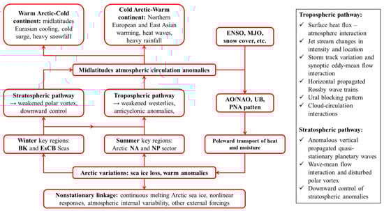 A brief synopsis of the Arctic–midlatitudes connection: interactive impacts, possible physical mechanisms (tropospheric and stratospheric pathways), and nonstationary. BK Seas denotes Barents–Kara Seas, EsCB Seas denotes East Siberian–Chukchi–Beaufort Seas, NA denotes North Atlantic, NP denotes North Pacific, AO/NAO denotes Arctic/North Atlantic Oscillation, UB denotes Ural blocking, PNA denotes Pacific–North American, ENSO denotes El Niño–Southern Oscillation, and MJO denotes Madden–Julian Oscillation.