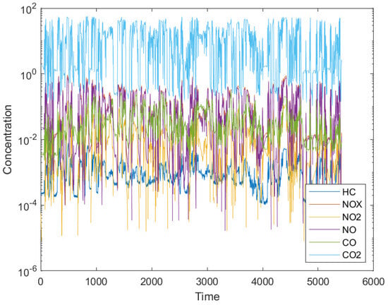 The data employed in this study were measured on a heavy-duty commercial truck of over 24 tonnes, Euro IV, equipped with Diesel Oxidation Catalyst (DOC), Exhaust Gas Recirculation (EGR), and Selective Catalytic Reduction (SCR) using Portable Emission Measurement System (PEMS) analyzers and complemented by additional instruments, such as a Global Positioning System (GPS) and weather station. The data concern two different vehicle trips, where the vehicle followed its regular driving route (the trip was not designed). The collected data from the first trip started on 23 January 2015 at 7:58:50 A.M. and finished on the same day at 9:29:11 A.M. The collected data from the second trip started on 21 January 2015 at 1:13:02 P.M. and finished on the same day at 2:07:51 P.M. The time resolution of the data was Δτ = 1 s. The following variables were included in the data: (1) speed–time traces, (2) pollutant emissions of HC, NO NO2, NOx, CO, and CO2, (3) ambient conditions, and (4) other vehicle information. The measurements from the first trip were used as the calibration dataset of the empirical model, while those from the second trip as the validation dataset. The time series of each pollutant for the calibration step are presented in Figure 1.