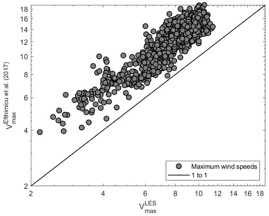 As mentioned above, the Vmax(Δτ), , I, and TV used in Equation (1) are calculated from the LES wind speed time series using the MATLAB software. The autocorrelation time TV was calculated using Equation (3) on the interval from 1.0 to 0.0. The temporal resolution of the wind speed time series was equal to Δτ = 0.45 s. A numerical peak Vmax(Δτ) was calculated for each sensor location, and a b value was estimated from Equation (1). According to Figure 4, the values of b range from 0.57 to 5.53, with only four values above 5, and the proposed b value (=6) is relatively close to the maximum value 5.53. The LES dataset clearly indicates that a value of b = 6.0 is appropriate for this flow scenario.