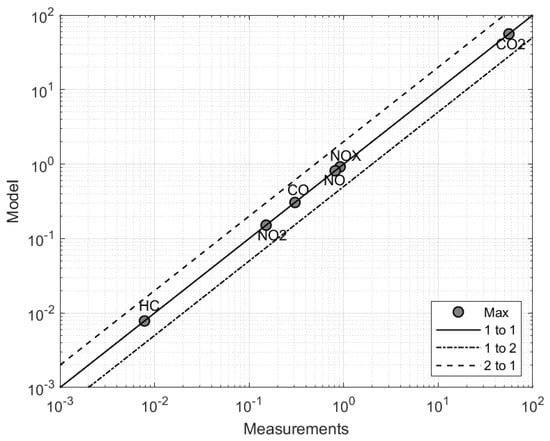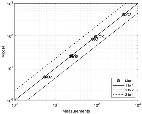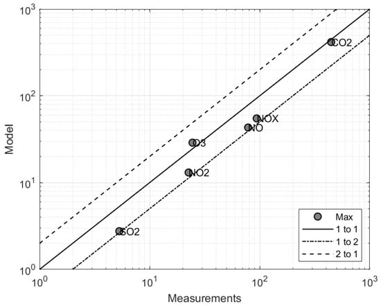Figure 9 presents the scatter plot where the empirical model is compared with the measurements. It should be noted that this particular scatter plot does not compare different pollutants but compares the model with the measurement for each pollutant. It is clear that all the points for all the pollutants lie on the ideal line (1:1), which is a positive result for the robustness of the model.