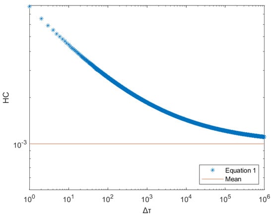 As an example, in Figure 10, Equation (1) is applied for the pollutant HC for various values of the time resolution Δτ. In this case, Equation (1) is applied by keeping the values of Table 2 constant, and only the variable Δτ is increased. It is obvious that the empirical model starts from the ‘maximum value’ and approaches the ‘mean value’ of Table 2, as the time resolution Δτ is increased. These results support the validity of Equation (1) to be used for real road vehicle emissions.