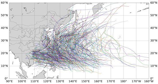 In this study, the WRF (version 4.2.1) [31] model was utilized to forecast the tracks of tropical cyclones [32], providing part of the input data for the deep learning models. Given the substantial computational resources and extended integration time required for WRF forecasts, typhoons from June to November in the Western North Pacific (WNP) from 2000 to 2022 were selected [33]. Only typhoons reaching or exceeding tropical storm strength (≥34 kts) and lasting at least three days are included in the forecasts. A total of 452 typhoon cases (Figure 1). The tracks were forecast with integration times of 24 h, 48 h, and 72 h. The forecasts were conducted with a horizontal resolution of 27 km, and the computational domain was defined by a rectangular area with an additional 100 km added to both the length and width to ensure complete coverage.