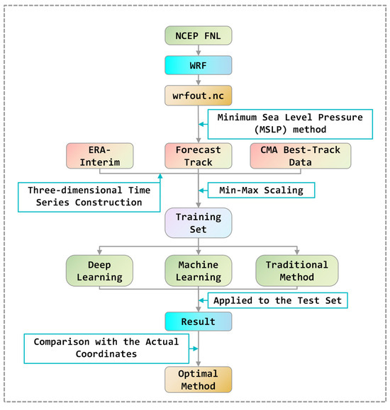 First, the WRF model is used to forecast pressure and wind fields, from which typhoon tracks are extracted. These tracks are then used to generate high-quality datasets through the CLIPER method and three-dimensional construction techniques. Subsequently, traditional methods, machine learning approaches, and deep learning techniques are employed to correct the WRF-forecasted tracks to match the actual tracks. The study places special emphasis on the critical role of BiLSTM and TN in the correction process, as well as the performance of different network architectures incorporating ConvLSTM modules (including WDL, NFM, and xDeepFM). Additionally, to investigate the sources of error and improve model interpretability, this research adopts the error decomposition method proposed by Hodson et al. [27], decomposing the MSE [28] into Bias2, distribution, and sequence components. Subsequently, error diagnosis and analysis are conducted for each correction scheme, providing insights for further model optimization.