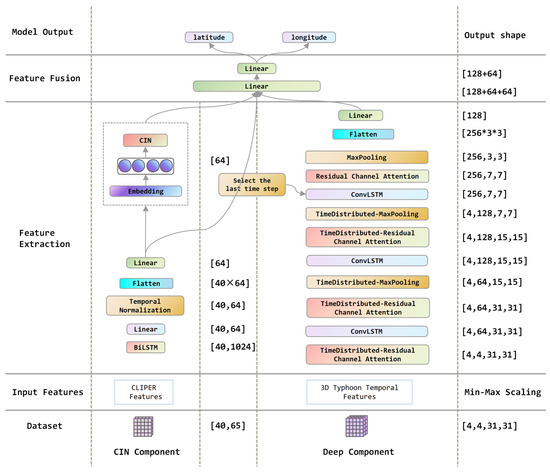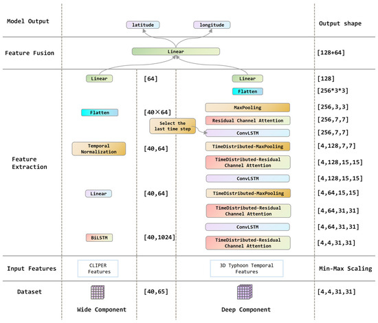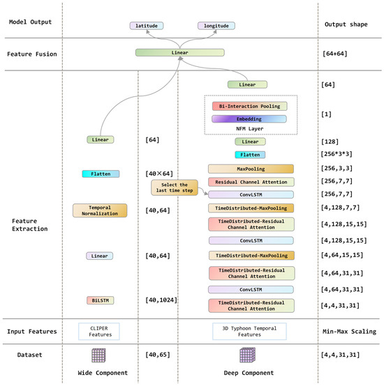 In this study, the WDL architecture (Figure 4) consists of feature extraction via a linear layer, fused with the deep component’s output. The final latitude and longitude predictions are made through a fully connected layer. The deep component includes ConvLSTM layers and a residual channel attention mechanism, processed with TimeDistributed layers to capture spatiotemporal characteristics of typhoon tracks.