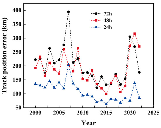 In recent years, research on correcting tracks predicted by the WRF model has been limited. A notable study conducted by Kyoungmin Kim [54] et al. in 2023 employed machine learning methods for track correction in the Western North Pacific (WNP) region. The study used data from the typhoon active season between June and November from 2006 to 2018. In their 72-h forecast, the track prediction error (TPE) was reduced from 179.02 km to 171.25 km, an improvement of approximately 4.34%. However, their testing dataset included data only from 2016 to 2018, while the current study uses data from 2018 to 2022. These differences in datasets limit direct comparability, making their results a reference point rather than a direct comparison.