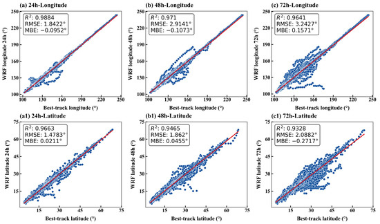 We used the WRF model to forecast typhoon tracks at different time scales and evaluated its performance using a series of metrics. Figure 7 compares the forecasted latitude and longitude results from the WRF model at 24-h, 48-h, and 72-h time scales with the actual tracks. To comprehensively analyze the model’s performance, we employed metrics such as TPE, RMSE, and MBE.