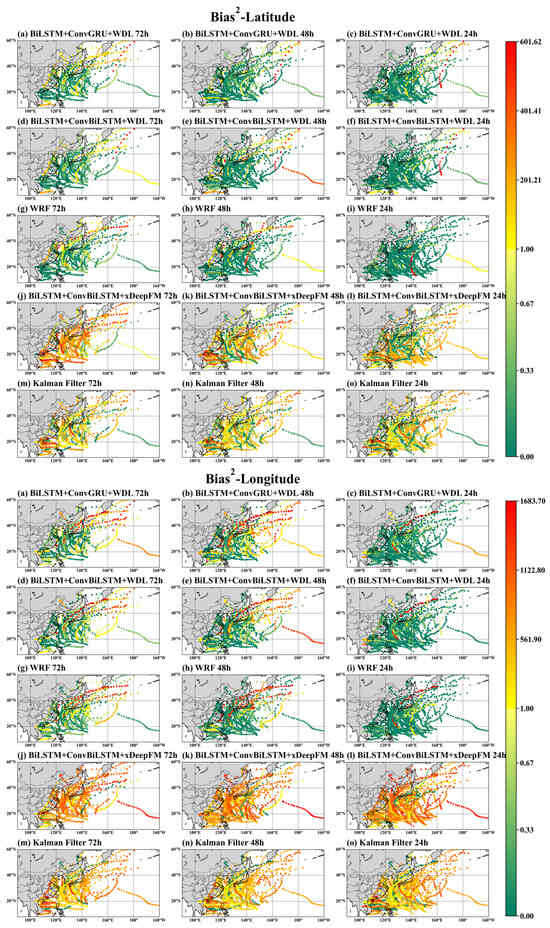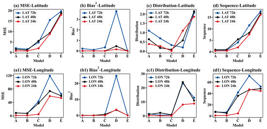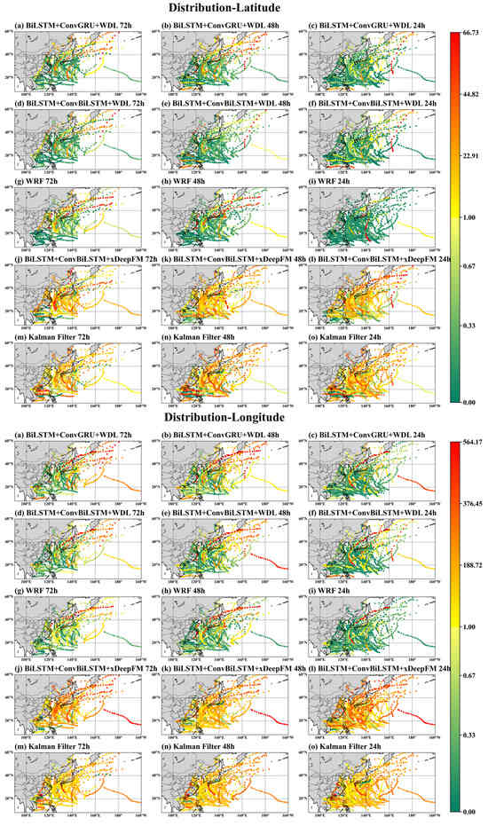 Overall, the models exhibit commonalities and differences in error patterns across latitudinal and longitudinal directions. MSE, Bias2, Sequence, and Distribution values are generally higher in the longitudinal direction, indicating that models are more prone to greater errors, systematic bias, poor data distribution consistency, and more pronounced lead or lag issues when forecasting longitude paths. Conversely, the models demonstrate more stable performance in the latitudinal direction, with smaller errors, closer data distribution to observations, and better temporal sequence consistency, especially in short-term forecasts. These differences highlight the need for future path forecast efforts to focus more on optimizing longitudinal processing to enhance overall forecast accuracy and improve model performance in long-term forecasts. Through the above comparative analysis, it is evident that the BiLSTM + ConvLSTM + WDL model outperforms the other models across various metrics, particularly excelling in key indicators such as Bias2, MSE, and Sequence. This model demonstrates balanced performance in both longitude and latitude, providing stable predictions, especially along the southeast coast and southern regions of China. As forecast time decreases, all statistical metrics show a downward trend, further confirming the BiLSTM + ConvLSTM + WDL model’s superiority in short timescales, significantly enhancing overall forecast outcomes.