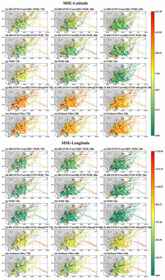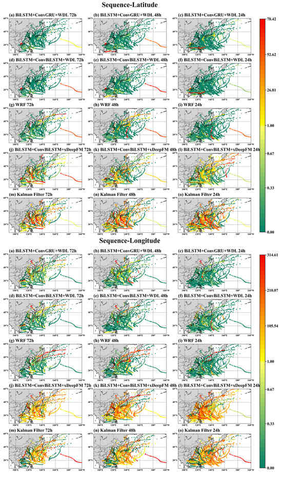 For Sequence, both the line charts and scatter plots (Figure 10 and Figure 14) reflect that Sequence values increase with forecast time, with a more pronounced increase in the longitudinal direction, suggesting poorer temporal consistency when forecasting longitude paths. The LSTM + ConvGRU + WDL model (A) consistently demonstrates the lowest Sequence values across all forecast times, particularly in the 24-h latitude forecast, indicating optimal temporal sequence consistency. In contrast, the Sequence values for the Kalman Filter (E) and BiLSTM + ConvLSTM + xDeepFM (D) models peak in the 72-h longitude forecast, indicating significant shortcomings in temporal sequence consistency for long-term path forecasts. In the Sequence-Latitude and Sequence-Longitude scatter plots (Figure 14), the BiLSTM + ConvLSTM + WDL model shows low temporal sequence errors in both latitude and longitude, particularly in the 24-h prediction, where regions like the southeast coast and southern China exhibit the lowest Sequence errors. This suggests that the model maintains good temporal sequence consistency, with more noticeable correction effects. However, the BiLSTM + ConvLSTM + xDeepFM model exhibits significantly higher Sequence errors in longitude, especially in complex path areas like the South China Sea and Taiwan Strait.