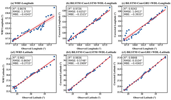 From Figure 15, it is evident that the BiLSTM + ConvLSTM + WDL model demonstrates a significant advantage over the BiLSTM + ConvGRU + WDL model in correcting WRF forecast results. The scatter plots show that the BiLSTM + ConvLSTM + WDL model achieves R2 values of 0.9726 and 0.9836 for longitude and latitude, respectively, which are both higher than the BiLSTM + ConvGRU + WDL model’s R2 values of 0.9242 and 0.9848. This indicates a stronger correlation between the forecast results and actual observation data for the BiLSTM + ConvLSTM + WDL model.