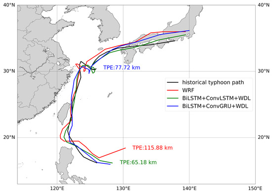 Recently, mainstream studies have leaned towards using deep learning methods for direct typhoon track prediction. For example, Jinkai Tan [52] et al. utilized the Gradient Boosting Decision Tree (GBDT) model in WNP tropical cyclone track forecasts, achieving errors of 138 km, 264 km, and 363.5 km for 24-h, 48-h, and 72-h forecasts, respectively. These values are significantly higher than the corrected TPEs obtained in this study, which are 75.31 km, 148.25 km, and 159.23 km after WRF forecast correction. Moreover, Pingping Wang [51] et al. used a 3D Convolutional Neural Network (3D CNN) to predict typhoon tracks in the WNP, achieving a TPE of 112.05 km for the 24-h forecast, which is also higher than the results obtained in this study.