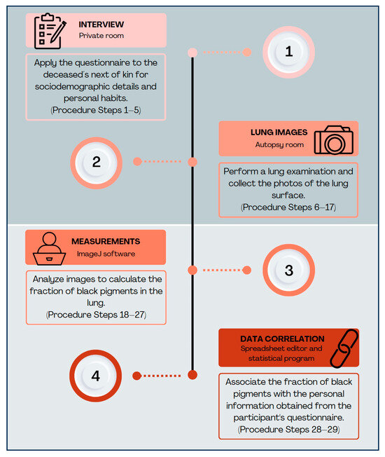 Note: After the autopsy procedure, additional details about prior diseases documented in the pathologist’s report should be collected, as they are crucial for constructing the subject’s profile, especially in studies that aim to correlate exposure to airborne particles with health outcomes. This note has been included at this point of the procedure because the interviewer may be responsible for requesting the report and entering the information into the study database.