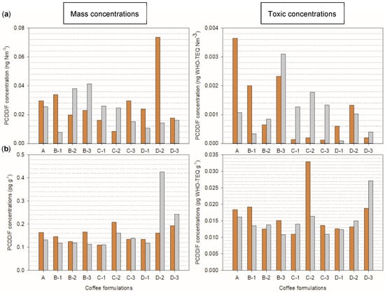 The mass and toxic concentrations in the flue gas are depicted in Figure 2a, with the values tabulated in Table S8. As shown in Figure 2a, the concentrations were detected in all flue gas samples collected during the fast and slow roasting of green coffee (A) and the coffee formulations (B-1 to D-3). The mass and toxic concentrations in the flue gas during fast and slow roasting of sample A were 0.0296 ng Nm−3 and 0.00364 ng WHO-TEQ Nm−3, and 0.0255 ng Nm−3 and 0.00107 ng WHO-TEQ Nm−3, respectively. These concentrations are much lower than the emissions from most combustion sources and the lowest regulation limit (0.1 ng WHO-TEQ Nm−3) [,]. However, given the lower stacks of coffee roasters and the possible escape of the flue gas to the surrounding environment, these concentrations can pose a risk to roaster operators and people within the vicinity [].