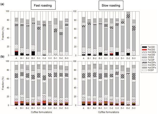 The congener profiles of the flue gas samples collected during fast and slow roasting are presented in Figure 3a. According to the figure, Octa-CDD (OCDD) was the main congener in all the coffee formulations during both fast and slow roasting, accounting for 48.9 ± 7.35% and 51.5 ± 8.12% of the total congeners, respectively. Octa-CDF (OCDF) was the second most predominant congener (18.5 ± 3.01% and 14.8 ± 5.42%), followed by Hepta-CDD (HpCDD) and Hepta-CDF (HpCDF) with around 7–10%. This pattern is similar to emissions from industrial sources [,,], mobile sources [,], and environmental samples [,].