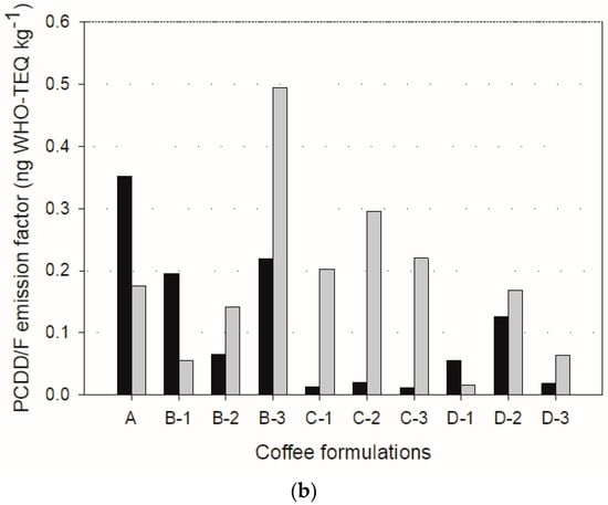 The emission factors for sample A were 2.86 ng kg−1 and 0.352 ng WHO-TEQ kg−1, and 4.17 ng kg−1 and 0.176 ng WHO-TEQ kg−1 for the fast and slow roasting methods, respectively. Therefore, the slow roasting method would be recommended to reduce toxic emission factors. However, the same cannot be concluded about the other formulations because the was no consistent trend. For instance, the emission factors during slow roasting were much higher in B-2, B-3, Cs, D-2, and D-3 formulations, as shown in Figure 4b.
