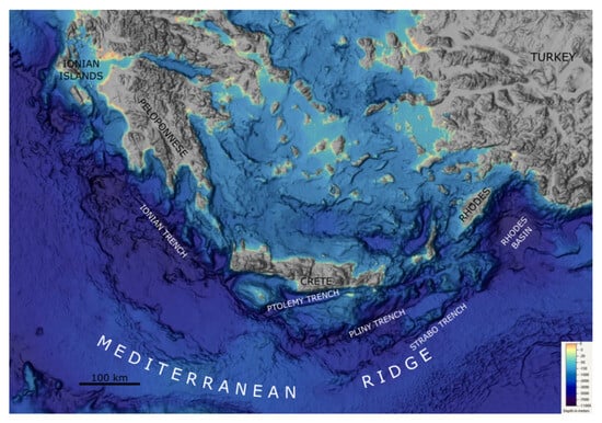 The Mediterranean Ridge and the Hellenic Trench around Crete.