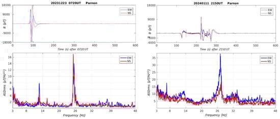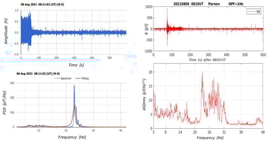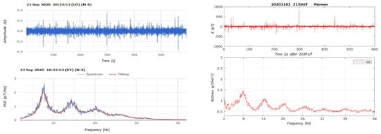 Typical ELF recordings 0–50 Hz, raw data (upper panels) and associated Fourier spectra (low panels), received by both the Greek (left) and the Polish (right) systems in our observing site on Mount Parnon. Schumann’s resonances around 7, 14, 21, and 28 Hz are evident in both spectra. PSD stands for “Power Spectral Density” in the Greek system recording (left). ASD stands for “Amplitude Spectral Density” in the Polish system recording (right). B stands for the magnetic field value (in pT). N–S denotes recordings from the North–South oriented coil.