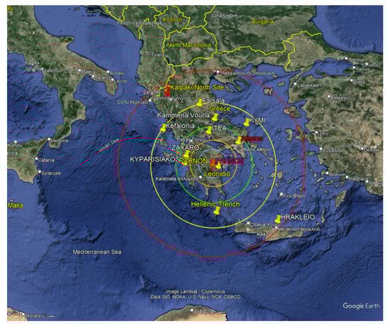 The epicenters of the EQs listed in Table 1 (yellow pins), as well as the position of the recording site (lower red pin) are also shown in Figure 4. The color circles around the recording station on Mount Parnon (red pin) indicate the radius of the preparation zones if the position of the station were the EQ epicenter. The outer red circle corresponds to an EQ of magnitude 6 on the Richter scale, while the inner blue circle corresponds to an EQ of magnitude 4. The other circles differ by 0.5 Richter from one another. From this figure, it is clear that an EQ that may occur in Heraklion on the island of Crete should have a magnitude of at least 6 on the Richter scale in order to be recorded by the station on Mount Parnon. The same applies to Kalpaki of Ioannina in the North of Greece (upper red pin in Figure 4).