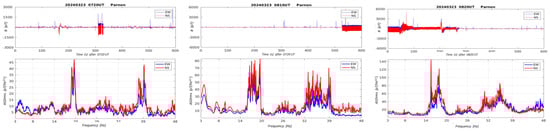 Typical strong perturbations in the raw data and spectra are considered potential precursor seismic signals. Simultaneous measurements were received by the Greek (blue) and the Polish (red) systems, respectively.