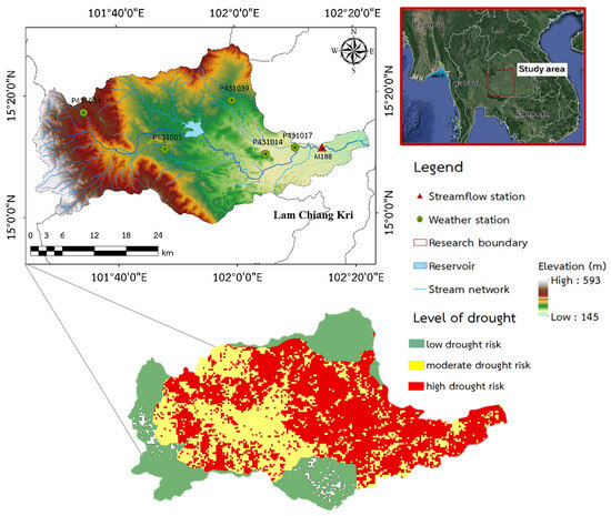The Lam Chiang Kri Watershed (LCKW) is located in northeastern Thailand, within the Isan Plateau, and serves as the upper branch of the Mun Watershed. Covering 2959.59 square kilometers, it has an elevation range of 145 m to 593 m above sea level (Figure 1) [22]. The terrain slopes from west to east, with predominantly laterite soil, which is a type of sandy loam with poor water-holding capabilities. As a result, hydrographs in this region display sharp rising limbs, high peaks, and steep recess limbs, indicating that rainfall quickly runs off rather than soaking into the ground, leading to rapid changes in streamflow levels [23].