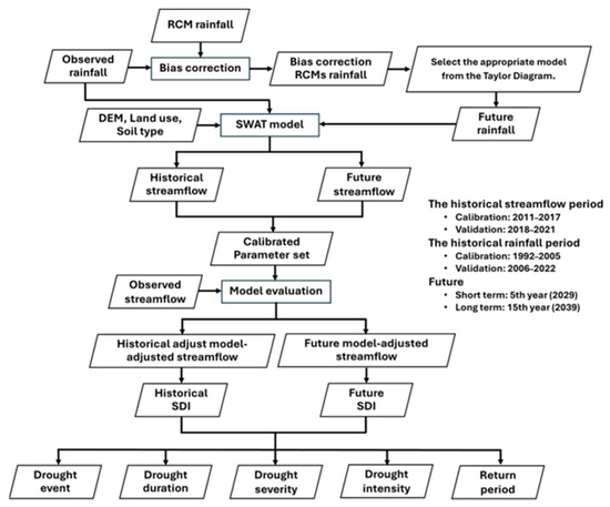 In this study, we utilized daily rainfall data from five gauges of the Thai Meteorological Department (TMD), covering the historical period from 1992 to 2022. Additionally, daily streamflow data from the gauge at the M188 station, provided by the Royal Irrigation Department of Thailand (RID), were used for the historical period from 2010 to 2021. The locations of these gauges are illustrated in Figure 1, while a schematic diagram of the overall framework is shown in Figure 2. For the projected periods, two specific years were selected, the 5th year (2029) and the 15th year (2039) from the current year, to assess the impact of climate change on hydrological drought. Observational rainfall and streamflow data were crucial to calibrating and validating the Soil and Water Assessment Tool (SWAT) model version 2012, as well as calculating the baseline (2010–2021) hydrological drought index. After performing bias correction, the ability of the global climate models (GCMs) to generate streamflow for the baseline period was evaluated. The output from all selected GCMs was then analyzed, with particular emphasis on the drought index results obtained from the best-performing GCMs.